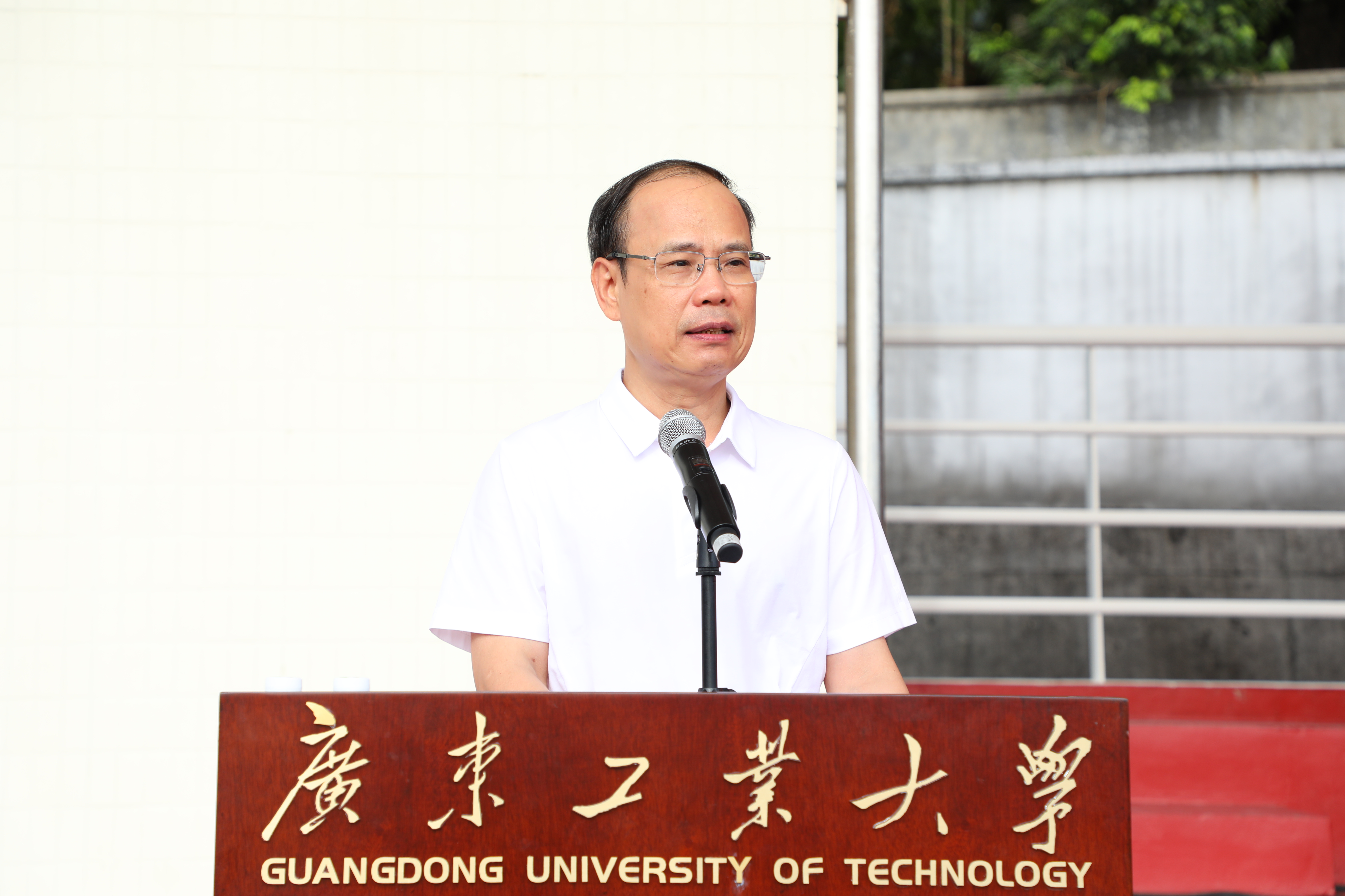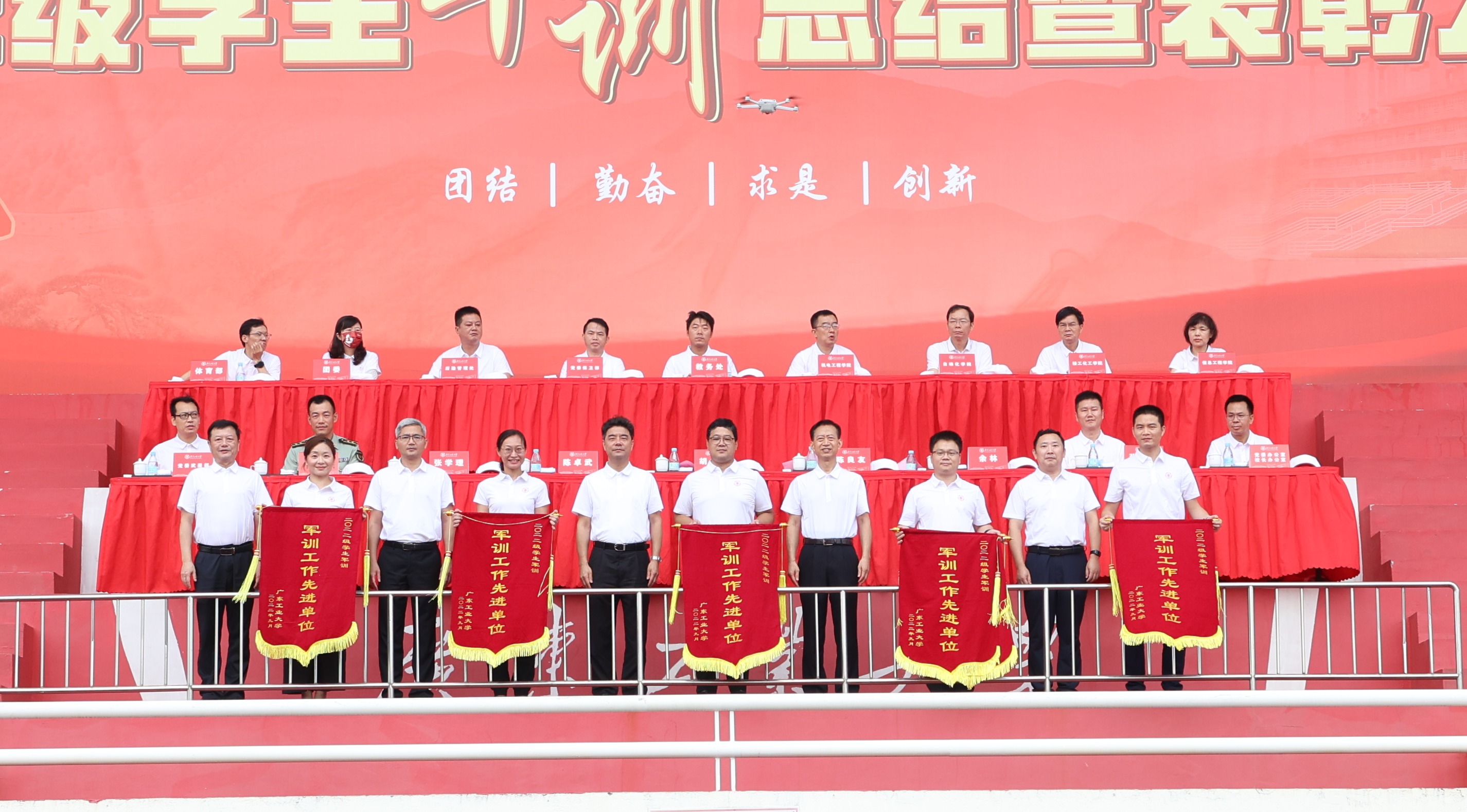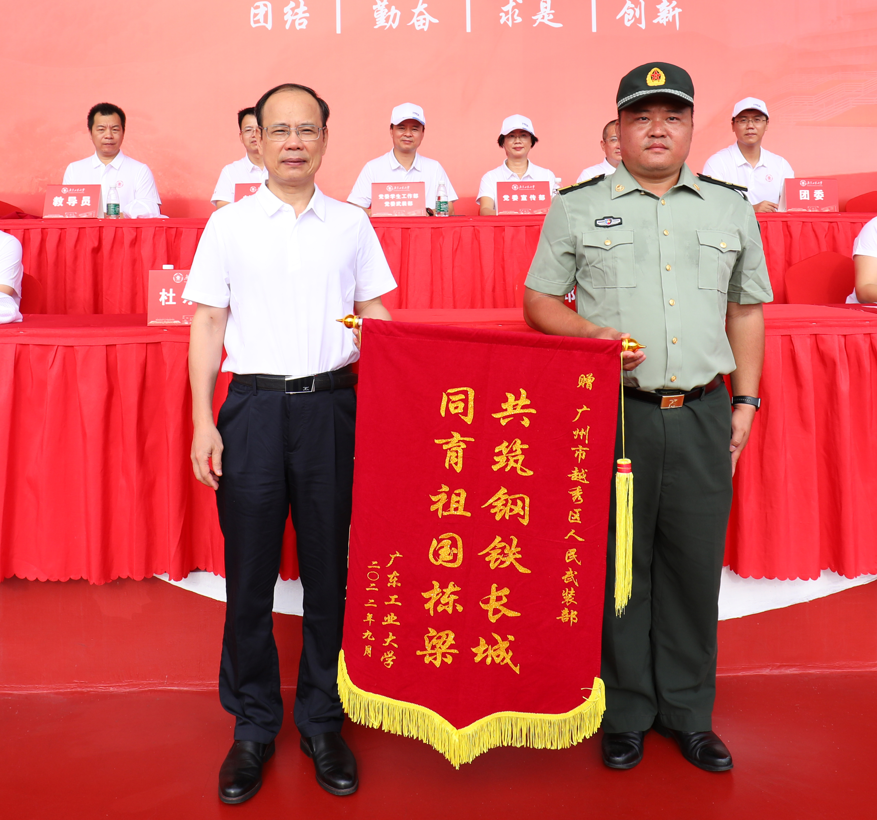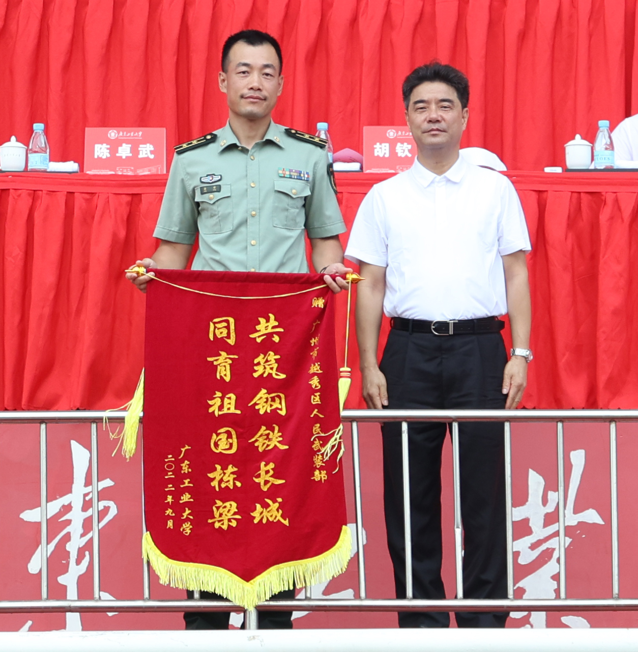 胡钦太、邱学青向承训单位越秀区人民武装部赠送锦旗。陈良友、朱蔚蔚、栾天罡宣读《关于表彰2022级学生军训先进集体和先进个人的决定》,校领导向获奖集体和个人代表颁发了锦旗。