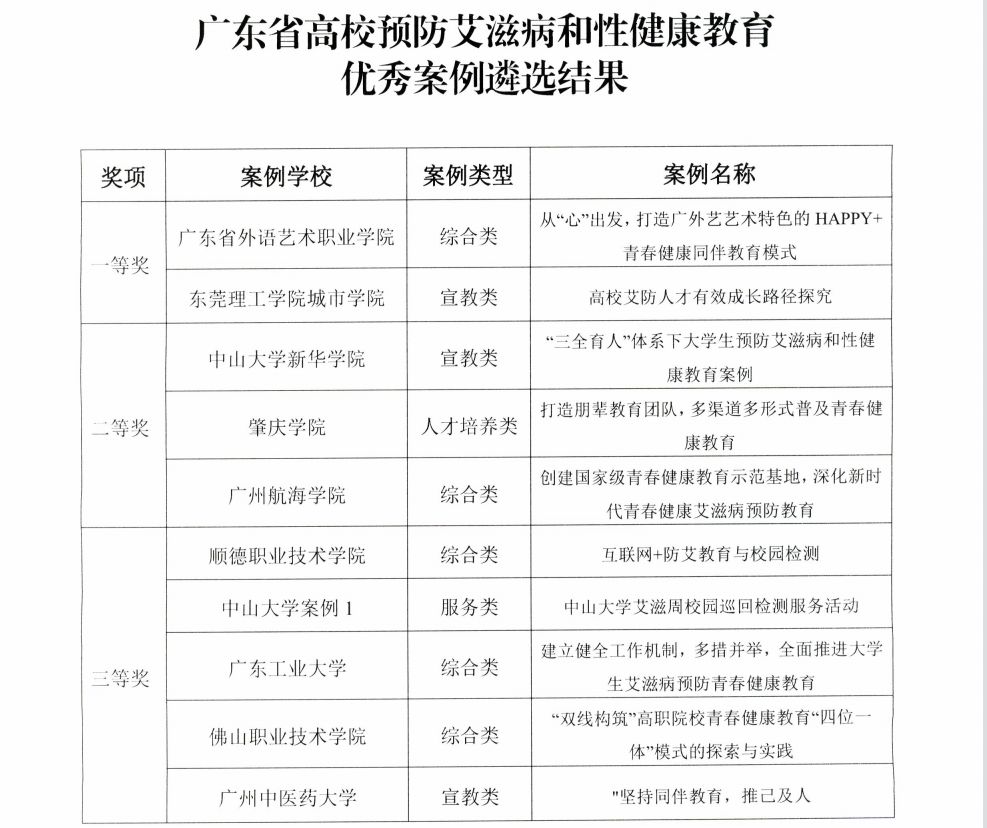 由学校计划生育办公室选送的案例《建立健全工作机制,多措并举,全面推进大学生艾滋病预防青春健康教育》,参加广东省教育厅组织开展的高校预防艾滋病和性健康教育现状调研和优秀案例征集活动,经省内外专家综合评审,荣获三等奖。