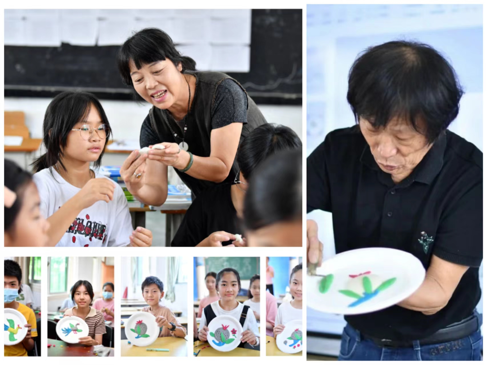 本次活动由开云网页版登录入口通识教育中心主任孙恩乐教授、副主任曹凤霞教授带队,艺术与设计学院曾翠玲老师、揭阳校区温华俊老师、非遗传承人曾镇悦大师以及艺术设计学院研究生、语言艺术团学生等一行12人参加。活动历时3天,分成多个小分队,行程上千公里,深入惠来、揭西两县七所中小学,进行了岭南灰塑、潮州抽纱、剪纸、国画、语言艺术(推普)5个方向的美育课程共20多场课堂教学示范,举办了6场次教改项目申报座谈会,对学校周边文化进行走访考察。活动得到了广东省教育厅体卫艺处、语委办、揭阳市教育局、惠来县教育局、揭西县教育局的高度重视,也得到惠来县、揭西县七校的大力支持,各校校长或分管领导、骨干教师50多人次参与了本次活动,受益学生600人以上。