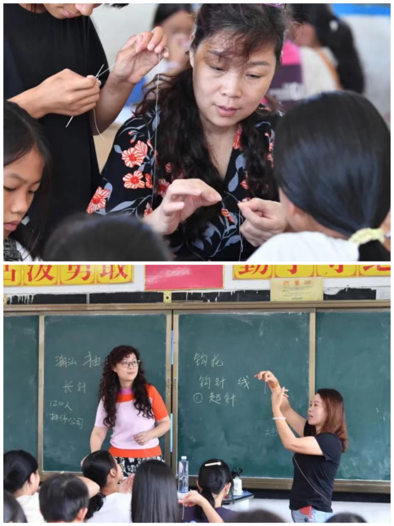值得一提的是,在广工美育团队精心打造下,在高光辉校长的大力支持下,华谢小学抽纱技艺兴趣小组初具规模、初见成效,已经做成校园文化品牌,实现了“课堂—学校—社区”三区浸润蓄能,形成了“师生互动、家校联动、社区绣娘进校园、非专业教师加入教学团队”的四维联动模式,实施了“学校教育制度化、民间实践灵活性、区域动员包容性”的保障体系,促使学生感受到社会对本土文化的认可,以此传承与延续乡土艺术文脉,成为学校一个闪亮的特色品牌。