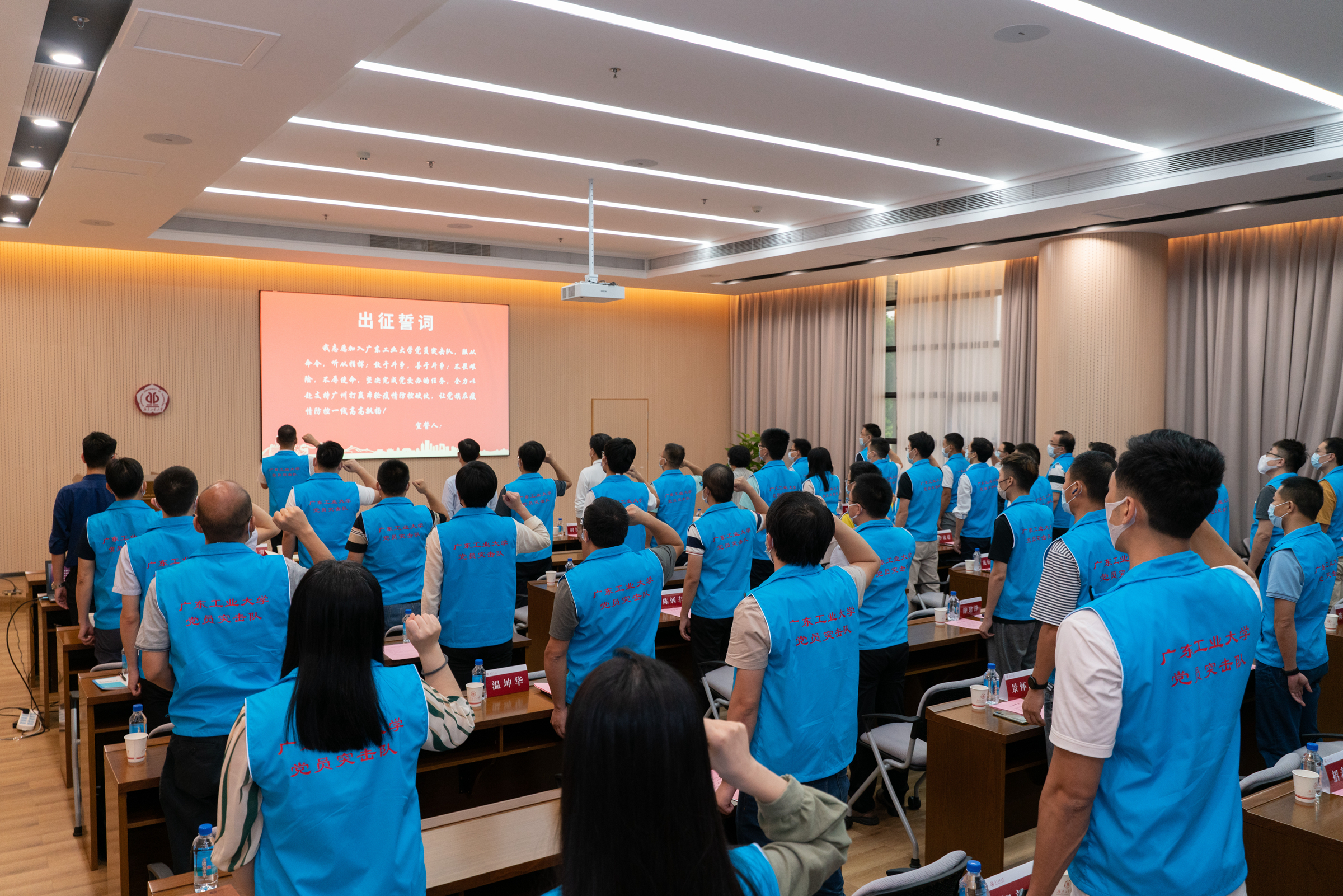 仪式最后,在突击队临时党支部书记、队长黄培清带领下,全体队员宣读出征誓词,以铿锵的誓言郑重表明“坚决完成党交办的任务,全力以赴支持广州打赢本轮疫情防控硬仗,让党旗在疫情防控一线高高飘扬”的坚定决心。