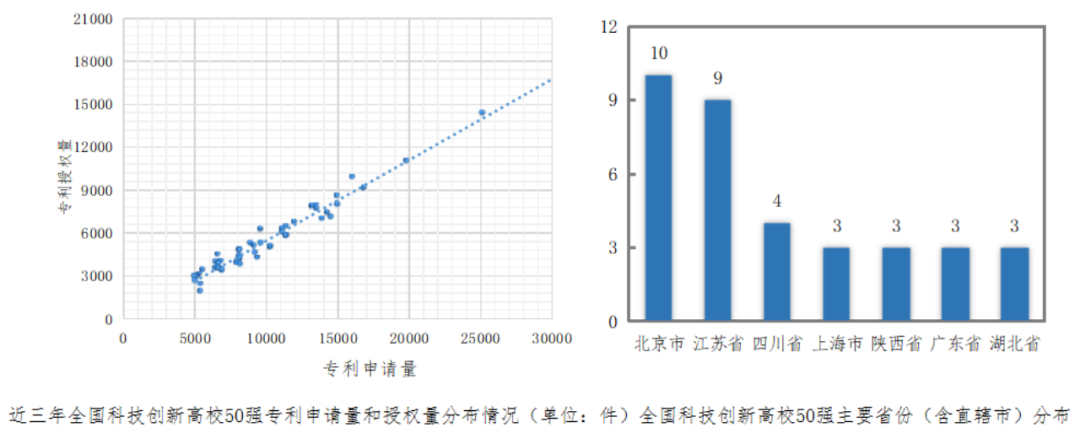 全国科技创新高校50强的专利申请量大多超过5000件,其中超40%的高校专利申请量高于10000件,约10%的高校专利申请量超过15000件,授权量超8000件。