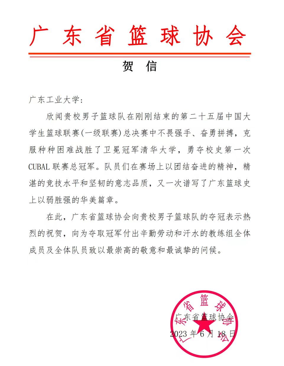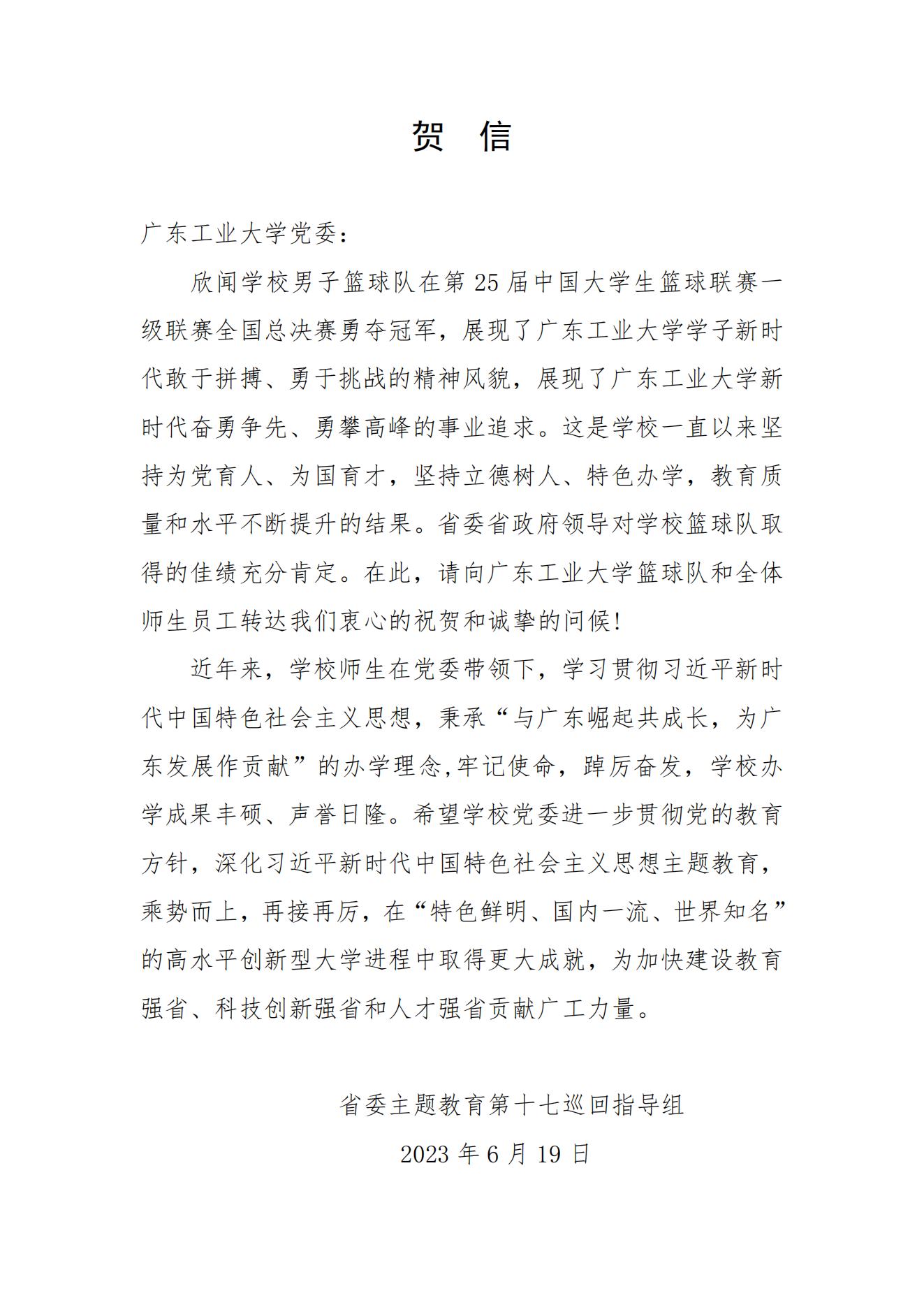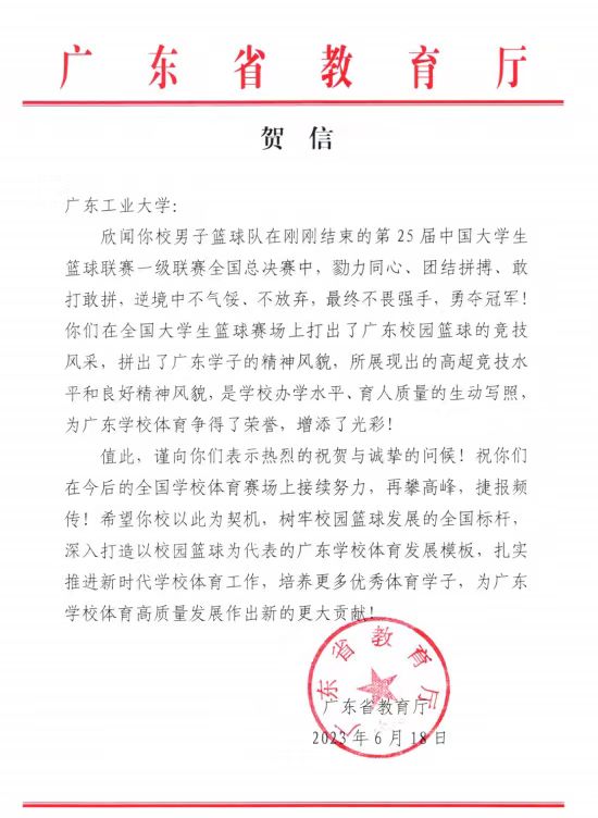 在刚刚结束的第25届中国大学生篮球联赛一级联赛全国总决赛中,我校男子篮球队南粤雄狮勇夺冠军。省委主题教育第十七巡回指导组、广东省教育厅、广东省篮球协会纷纷发来贺信表达祝贺和问候,贺信中对我校一直以来坚持为党育人、为国育才,坚持立德树人、特色办学,教育质量和水平不断提升给予充分肯定。广工男篮在比赛中团结拼搏、永不言弃,展现了开云网页版登录入口学子新时代敢于拼搏、勇于挑战的精神风貌,打出了广东校园篮球的竞技风采,谱写了广东篮球史上以弱胜强的华美篇章。