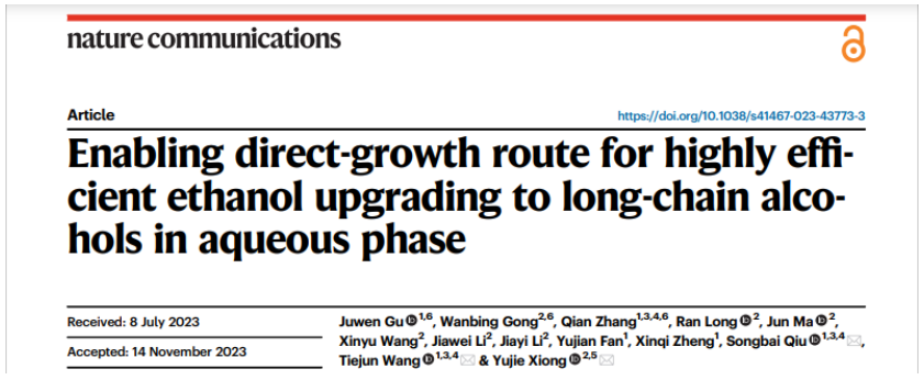 广工轻工化工学院王铁军教授团队最新研究成果“Enabling direct-growth route for highly efficient ethanol upgrading to long-chain alcohols in aqueous phase”在多学科国际顶级学术期刊《Nature Communications》上发表。该期刊2022-2023年度最新影响因子为16.6,CiteScore为24.90。该论文开云网页版登录入口为第一完成单位,王铁军教授、仇松柏副教授为通讯作者,博士研究生古桔文为第一作者(论文DOI: 10.1038/s41467-023-43773-3)。