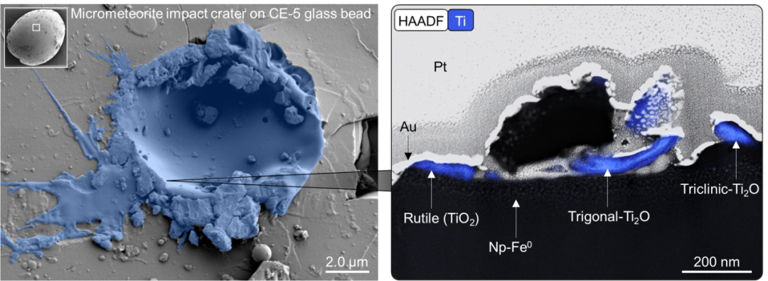月壤微陨石撞击坑中的Ti纳米矿物(左图为假彩色图,蓝色区域为撞击溅射物)