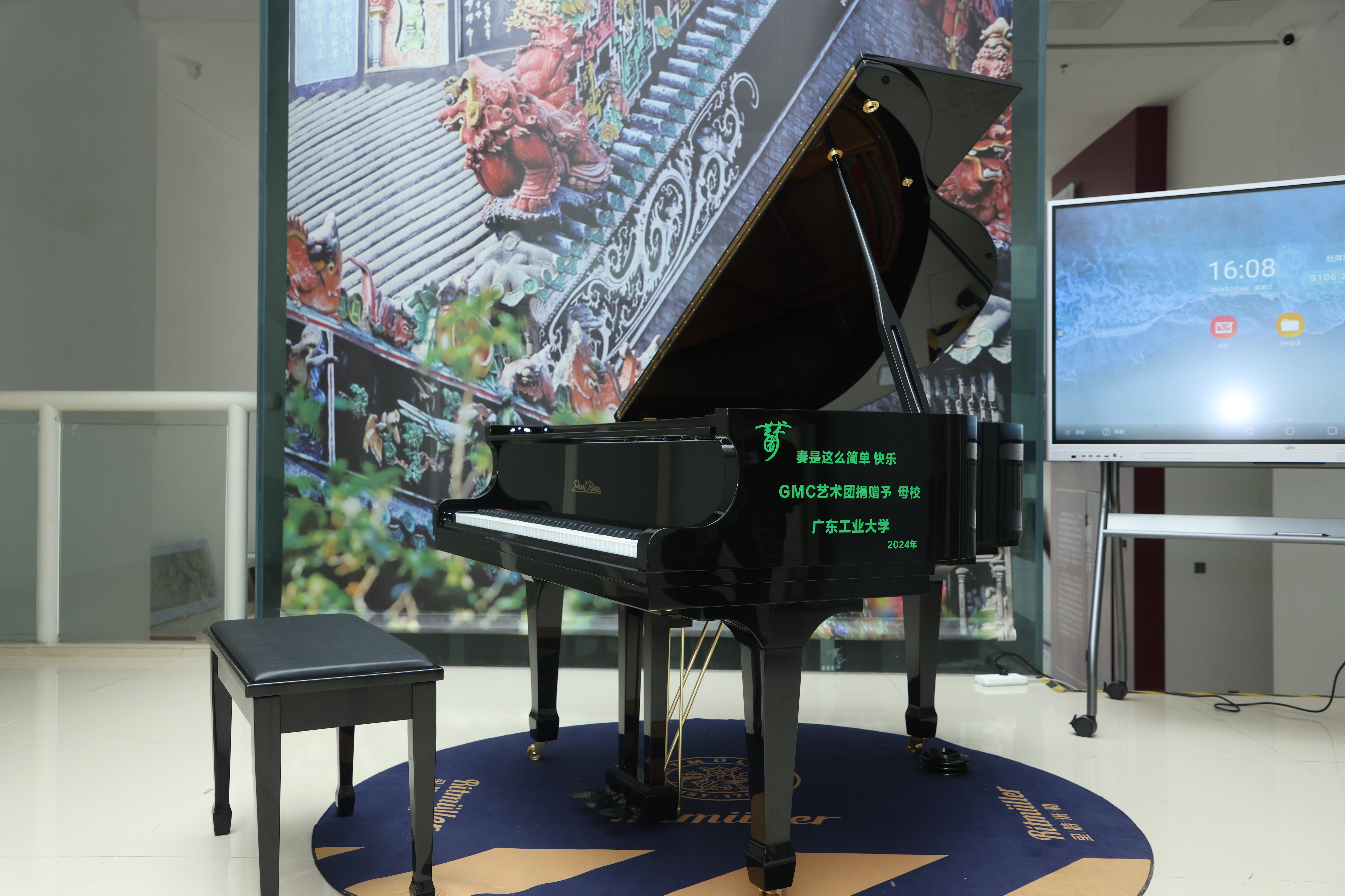 捐赠仪式上,GMC艺术团校友代表向母校开云网页版登录入口捐赠了1台全新三角钢琴,胡钦太代表学校接受捐赠并向GMC艺术团颁发捐赠证书。获赠三角钢琴将摆放在学校文化活动中心美育实践空间公共区域,定期向师生开放,用于学生实践练习、美育设备展示等。