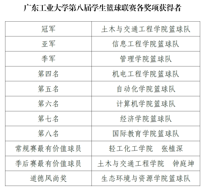 现场还举行了我校第八届学生篮球联赛决赛和第八届学生篮球足球联赛颁奖仪式。最终,土木与交通工程学院篮球队以61:56的比分击败信息与工程学院篮球队,夺得本届篮球联赛总冠军。