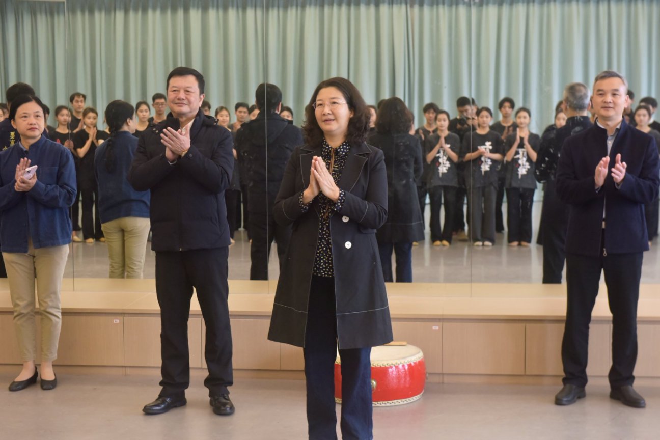 2月21日, 校党委副书记、学校赴港演出交流活动工作专班副主任朱蔚蔚,校原党委常委、副校级干部、工作专班副主任张学理,到大学城校区文化活动中心舞蹈排练室,亲切看望慰问大型舞台情景剧《青春印丰碑》集中排练的演职师生,并送上新春祝福。通识教育中心主要负责人陪同。