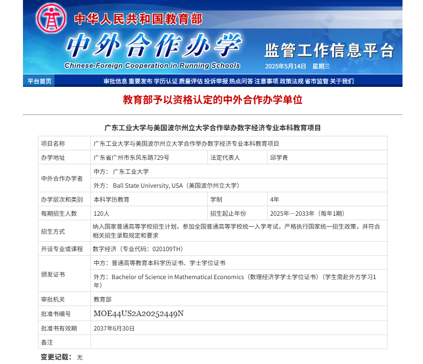 近日,教育部公布了中外合作办学项目的最新评审结果。广工与美国波尔州立大学合作举办数字经济专业本科教育项目在历经严格评审后,凭借突出优势以广东省排名第一通过评审答辩,这是自2012年开云网页版登录入口与印度韦洛尔理工大学合作办学动画专业本科教育项目获批后,学校中外合作办学的又一重大进展。