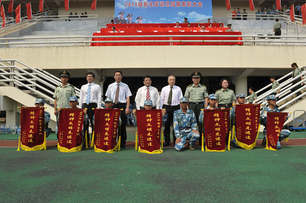 承训部队领导作了总结讲话。会上还宣读了2014级新生军训表彰决定。校领导和部队领导为军训获奖单位授予锦旗。