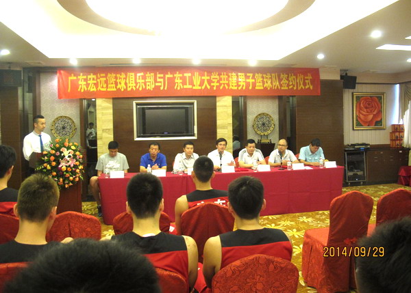 本网讯9月29日下午,我校与广东宏远俱乐部在东莞举行签约仪式,正式共建男子篮球队。副校长陈卓武代表学校与广东宏远俱乐部签约。省体育局篮排运动管理中心主任张镇民,广东宏远俱乐部董事长陈海涛、副总经理胡志强、宏远男篮主教练杜锋,我校体育部负责人,校男篮乙组主教练刘炜浩出席,我校乙组男子篮球队、宏远一队和青年队队员参加。