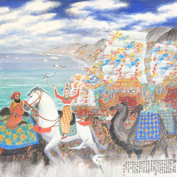 《亚洲之路》作品题材源于马可波罗《东方见闻录》。元世祖忽必烈将女儿阔阔真公主远嫁波斯的故事。他们从泉州出发,走海上丝绸之路,沿途船队播下了和平友好的种子,促进了与中亚的文化、经济的交融,开启了亚洲共同繁荣发展的和平之路。陈天被称为“多元艺术家”,他的作品传达了在现代与传统、西方与东方、融合与固守的多元文化冲击中,身为一个文化人、一个画家的思考、选择和实践。