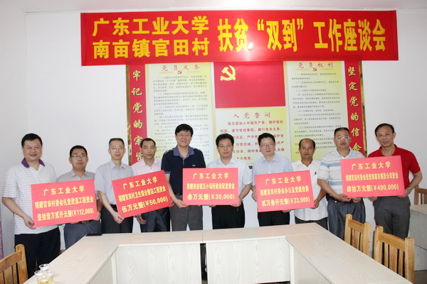 校领导代表学校向官田村捐赠了40万元入股城投公司、11.2万元村礼堂(卫生站)翻新改造项目款、5万元村卫生综合整治工程项目款、2.3万元村办公和党建经费,向南亩镇捐赠了3万元惠民广场工程款,为贫困户发放住房改造帮扶金和生产发展帮扶金。工作组一行还察看了翻新改造好的村礼堂(卫生站)、健身文体广场和进村道路旁的太阳能路灯。