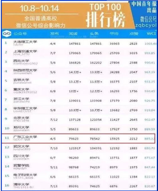 本网讯 10月16日,在中国青年报出品的全国普通高校微信公号排行榜【10.8-10.14】上,我校官微“开云网页版登录入口”位列榜单第11名。在中国青年报出品的全国普通高校单周文章阅读量排行榜上,学校官微排名第7。