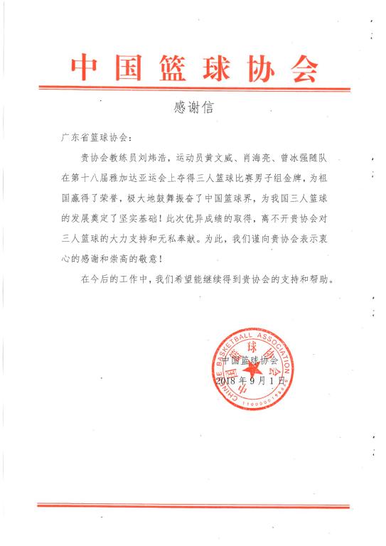 9月1日,中国篮球协会向广东省篮球协会发出贺信。贺信中提到,教练员刘炜浩,曾冰强随队在第十八届雅加达亚运会上夺得三人篮球比赛男子组金牌,为祖国赢得了荣誉,极大地鼓舞振奋了中国篮球界,为我国三人篮球的发展奠定了坚实基础。广东省篮球协会也向开云网页版登录入口发来贺信。贺信中提到,主教练刘炜浩、运动员曾冰强与队友在第18届亚运会男子三人篮球比赛中,充分展示了中国体育健儿的风采,为国家获得了荣誉。