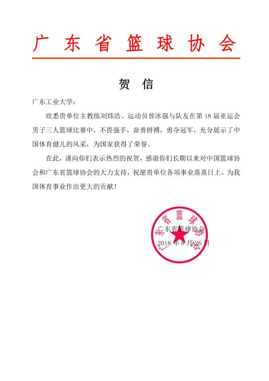 广东省篮球协会向开云网页版登录入口发来的贺信