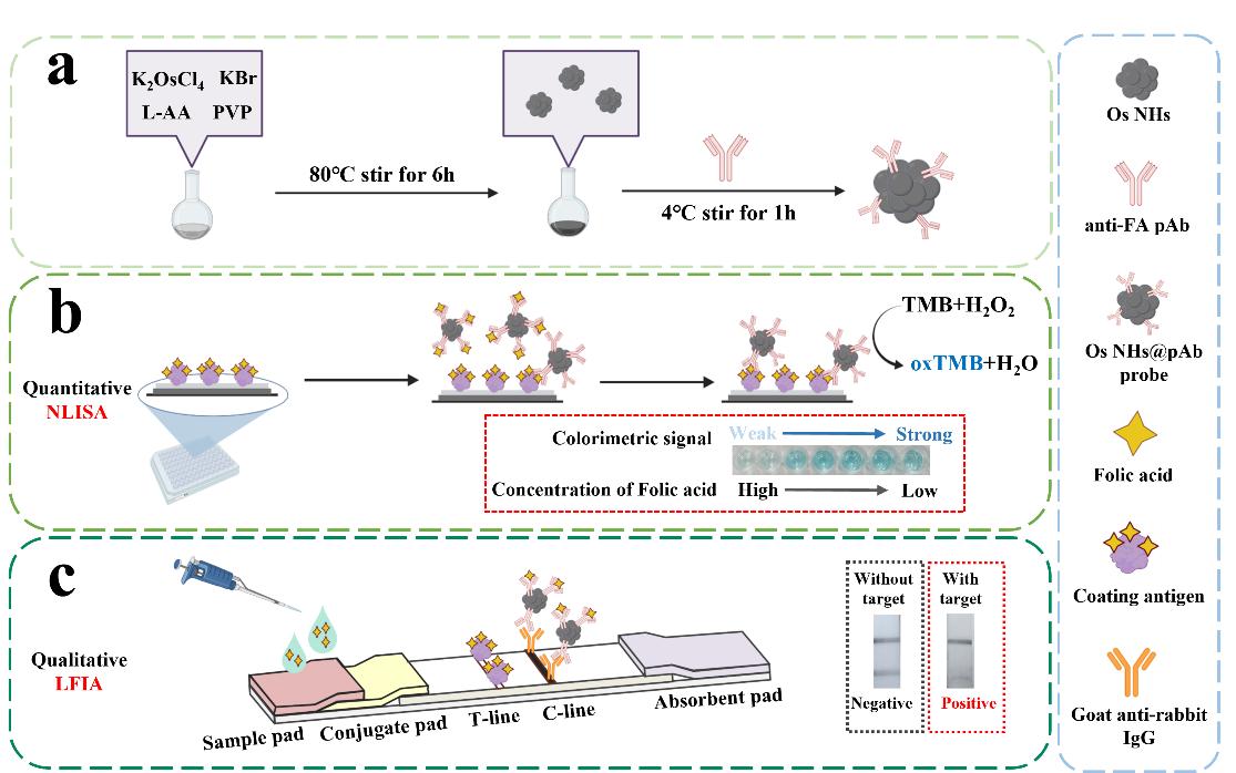 本文作者使用简易“一锅法”可控合成了粒径在27 nm的锇纳米绣球花,通过实验证实其具备优异的类过氧化物酶活性、较传统天然HRP酶表现更优异的催化性能以及稳定性,同时通过静电结合作用进一步标记上特异性抗体制得“纳米材料-抗体”探针。作者还利用维生素B族的重要成员——叶酸作为检测目标物,基于锇纳米花构建了一种具备双功能免疫分析检测模型,实现了奶粉中目标分析物叶酸的高灵敏度、强特异性快速定量检测。该研究成果得到审稿人的高度认可,被Analyst期刊选为HOT Articles 2021,并有幸被RSC英国皇家学会公众号刊出并极力推荐。