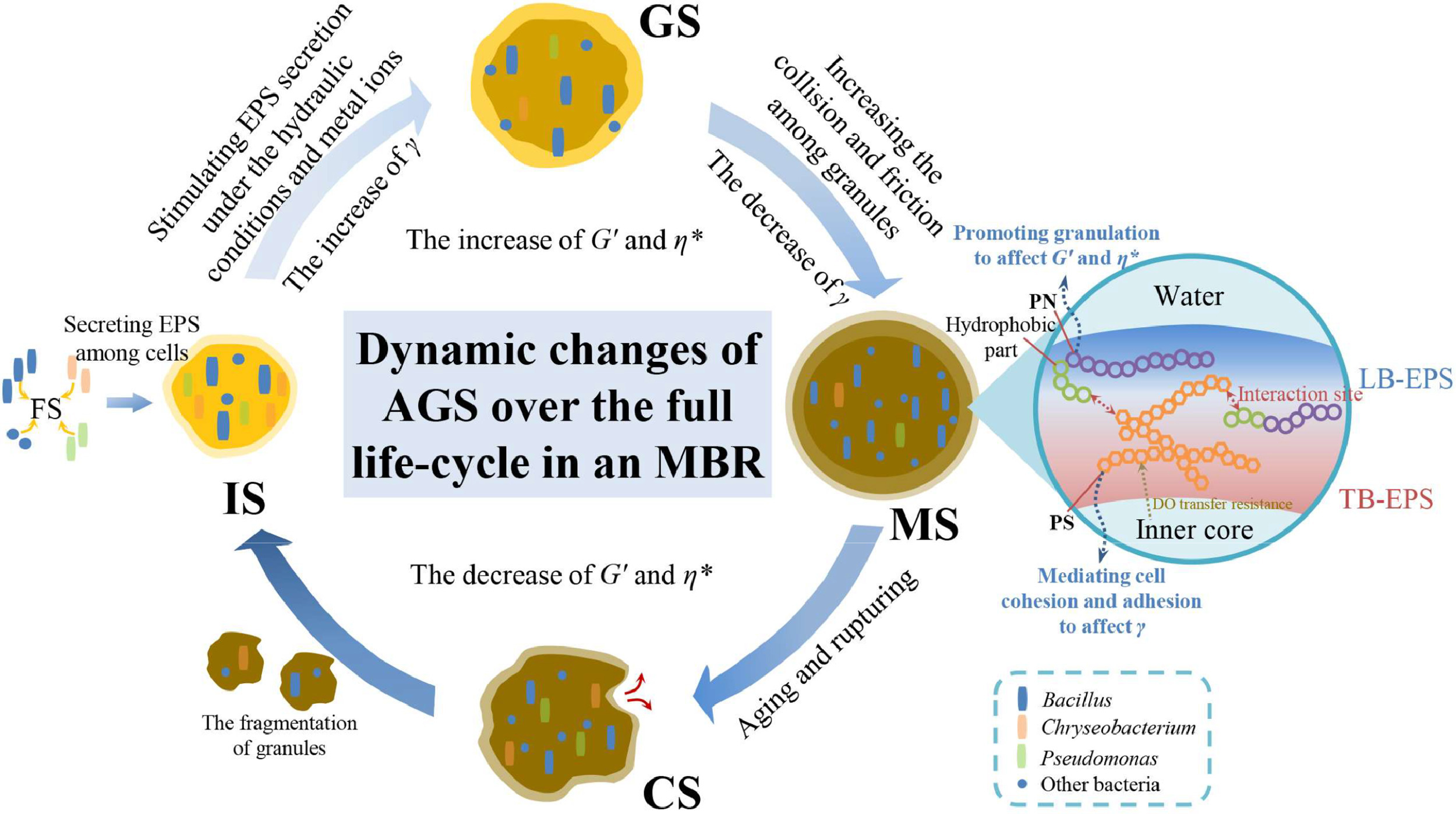 好氧颗粒污泥(AGS)技术作为一种有望替代传统生物工艺的污水处理技术,具有能源消耗少、占地面积小等优势,但AGS的稳定性则是能否发挥上述优势的关键,在长期运行过程中显得非常重要。而AGS在连续流膜生物反应器(CFMBR)和传统的序批式反应器(SBR)中的造粒机理存在很大差异,因此本研究通过追踪CFMBR中不同阶段好氧颗粒污泥(AGS)物理化学和微生物群落组成的异质性,以认识AGS的全生命周期过程。研究结果表明:AGS全生命周期各个阶段体现出明显的异质性,并影响整体的流变和传质特性,其中AGS的储能模量(G')在成熟期达到最大值,这与胞外聚合物(EPS)中所含蛋白质(PN)和粒径大小呈显著正相关。然而,当施加较大的剪切应变时,该时期AGS相比其他时期更易裂解,这与较大粒径和较少的多糖(PS)含量及其相关官能团有关。基于不同时期AGS物理化学、微生物学特性的分析,证实了在封闭系统中AGS存在明显的生命周期并影响了系统的稳定性。