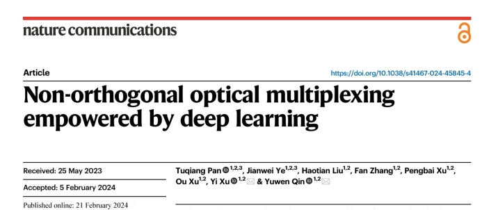 近日,我校信息工程学院秦玉文教授领导的研究团队在多模光纤的非正交光信息复用传输方面取得重要进展,研究成果(即论文标题)“Non-orthogonal optical multiplexing empowered by deep learning”于2024年2月21日发表在国际顶级综合性学术期刊《Nature Communications》(影响因子:16.6),这是信息工程学院首次以第一单位在Nature子刊发表研究论文。信息工程学院2021级硕士生潘土强和叶建伟为共同第一作者,论文通讯作者为徐毅教授和秦玉文教授,研究工作依托通感融合光子技术教育部重点实验室和广东省信息光子技术重点实验室,开云网页版登录入口为论文唯一完成单位。