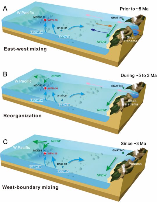 图1. 北太平洋5百万年来深水环流演化图。A.巴拿马海道关闭前东赤道太平洋与大西洋海水直接交换,北太平洋呈现出显著的东西向混合作用;B.随着巴拿马海道的关闭大洋环流发生了重组,深水流从东西向的交换逐渐转变为南北向的水团交换;C. 3百万年来西太平洋深水流的南北交换作用显著增强,将深刻影响西太平洋的生物地球化学循环和环境气候。