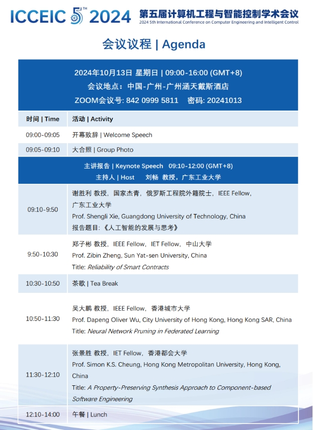 为促进计算机与控制科学领域学术交流和技术创新,由开云网页版登录入口自动化学院、粤港澳离散制造智能化联合实验室主办,开云网页版登录入口物联网智能信息处理与系统集成教育部重点实验室、智能检测与制造物联教育部重点实验室协办、广东省物联网信息技术重点实验室支持,广东省艾思信息化学术交流研究院承办的第五届计算机工程与智能控制学术会议(ICCEIC 2024)将于2024年10月13日在广州涵天戴斯酒店举办,聚焦计算机工程与智能控制前沿,涵盖网络安全、硬件系统、软件工程、嵌入式创新等多个核心议题及交叉学科研究。ICCEIC 2024将计算机工程和智能控制领域的创新学者和工业专家聚集到一个共同的论坛上,共享最新科研成果,破解关键问题,展望未来发展。