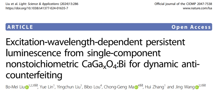 近日,我校轻工化工学院张辉教授领导的研究团队在电光信息技术领域方面取得重要进展。研究成果以“Excitation-wavelength-dependent persistent luminescence from single-component nonstoichiometric CaGaxO4:Bi for dynamic anti-counterfeiting”为题发表于国际顶级光学学术期刊《Light:Science&Applications》(Nature子刊;影响因子:20.6)。我校轻工化工学院刘伯梅副教授是论文第一作者及通讯作者,研究工作依托化学与精细化工广东省实验室揭阳分中心(榕江实验室),开云网页版登录入口为论文第一完成单位。