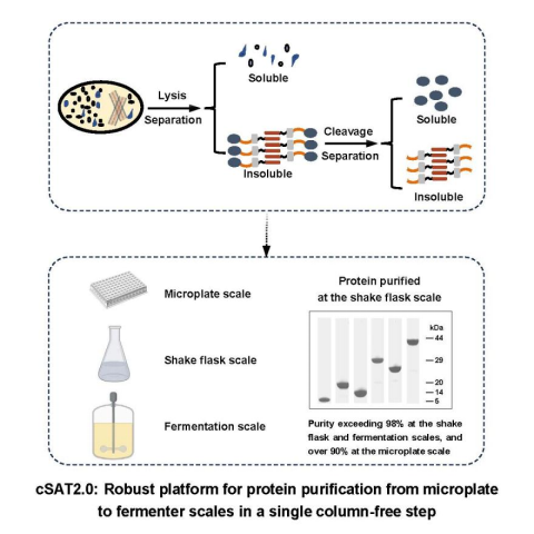 蛋白(酶)纯化是生命科学基础研究与生物技术产业的底层技术。研究团队前期开发了可自聚集并可自我切割的标签(cleavable self-aggregating tag, 简称cSAT)蛋白纯化技术,适用于多种目标蛋白的纯化,包括含二硫键蛋白。然而,cSAT技术纯化后的蛋白纯度通常为80-85%左右。其中,主要的杂蛋白是切割后的cSAT标签。在本项目工作中,研究团队使用了耐辐射极端微生物中一段蛋白酶的前肽序列(PEP),将其引入聚集肽和可切割内含肽元件之间,成功解决了杂蛋白cSAT标签问题。研究团队将cSAT2.0技术用于多种不同类型的蛋白(包括二硫键蛋白)纯化,即冠状病毒的肽类抑制剂(LCB3)、人生长激素(hGH)、纳米抗体(Nb21和caplacizumab),以及酶(GST和木聚糖酶),纯度均达98%或以上。