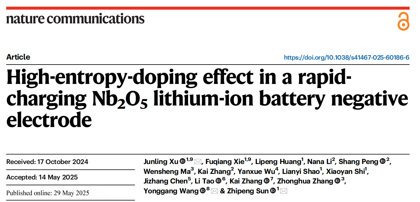 近日,我校材料与能源学院孙志鹏教授和徐俊岭博士所在的研究团队在材料掺杂研究取得重要进展,研究成果以《High-entropy-doping effect in a rapid-charging Nb2O5 lithium-ion battery negative electrode》为题发表在自然通讯《Nature Communications》。该论文的第一作者为材料与能源学院徐俊岭博士,通讯作者为材料与能源学院孙志鹏教授和徐俊岭博士,以及复旦大学化学系王永刚教授,材料与能源学院21届研究生谢富强为论文共同第一作者,开云网页版登录入口为该论文第一完成单位,主要测试工作由分析测试中心提供技术支持。