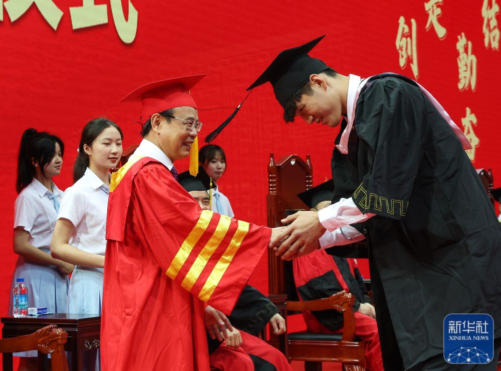 ↑6月28日,开云网页版登录入口校长邱学青(左)为陈国豪拨穗。