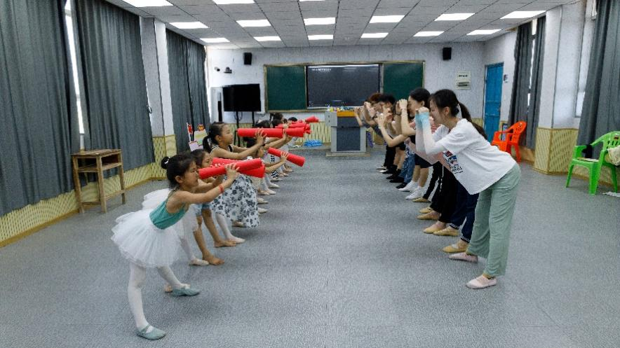 广工高水平舞蹈团学生对京陇学校学生进行一对一教学指导