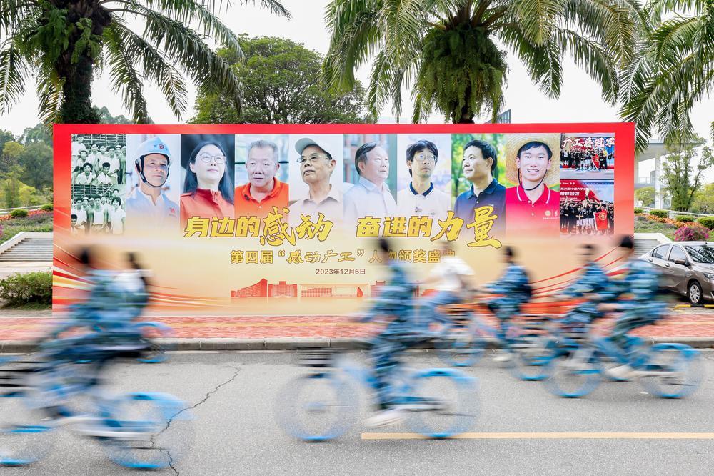典礼上,主持人通过现场访谈,展示“感动广工”人物背后的故事;大屏幕播放的事迹短片,描摹广工人奉献敬业、奋力担当的模样;舞台上精彩的舞蹈表演,鲜活展现了为国家发展做贡献的形象。现场还邀请了感动人物的父母、师友和学生,讲述动人事迹,为亲人骄傲和加油。“淡泊名利一心育人”“温故知新感师恩”……观众席中亲友团手举横幅海报,向心中的榜样致敬。
