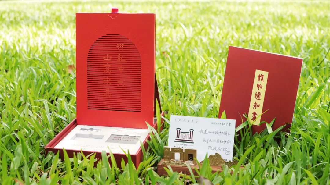 在开放日现场,中山大学2024年本科录取通知书正式亮相。礼盒内不仅有中大校徽,还有一枚“世纪之门”徽章,用数字“100”的形态汇聚光影。此外,还有18厘米长的“山高水长”镇纸搭配“世纪之门”徽章和山峦插片,徽章和山峦插片可自由摆放,镇纸上的卡槽内也可自由放置录取通知书、珍贵照片、明信片、日历卡等多种物件。