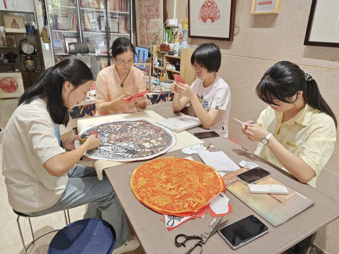在国家级非遗项目(潮阳剪纸)省级代表性传承人郑少燕女士的介绍下,队员们对潮阳剪纸的文化内涵与风格特色有了进一步的了解。队员们在郑少燕女士的悉心指导下学习潮阳剪纸,掌握了剪纸的基本技巧,并充分发挥创造力,结合潮阳剪纸中丰富多彩、寓意吉祥的图案,设计文创产品。