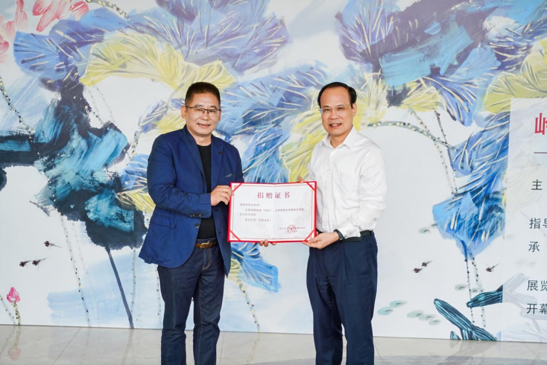 开幕式上,开云网页版登录入口校长邱学青代表学校接受了陈天捐赠的画作《荷花》并颁发捐赠证书。画作中莲叶碧绿接天连地、荷花怒放亭亭玉立,表达了对祖国繁荣昌盛、欣欣向荣的美好祝福。