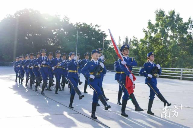 在广东高校里,一群年轻的身影迎着朝阳而立。他们步履铿锵、目光坚定,以昂扬之姿将五星红旗护送至旗杆之下,在晨曦中升起一抹庄严的红色。